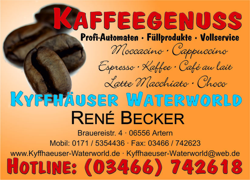 Kyffhäuser Waterworld · Inhaber: René Becker · Brauereistr. 4 · 06556 Artern · Telefon: 03466/742618 · Fax: 03466/742623 · kyffhaeuser-waterworld@web.de